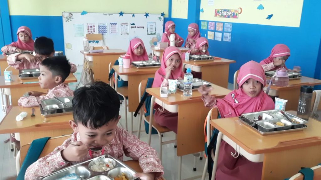 Suasana kegiatan terlihat penuh keceriaan. Siswa antusias menikmati hidangan yang telah disiapkan, sementara guru memanfaatkan momen ini untuk memberikan edukasi mengenai pentingnya makanan sehat, pola makan bergizi seimbang, dan kebersihan diri.