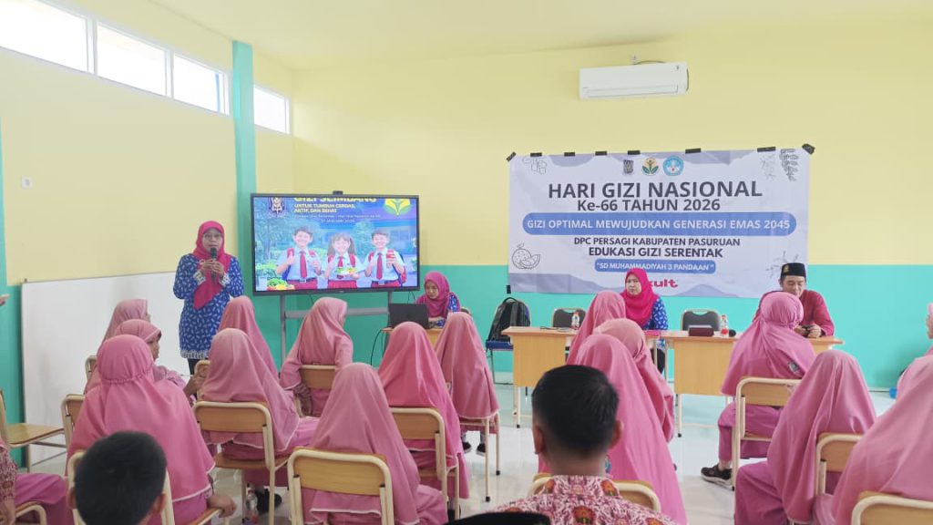 Pandaan, 21 Januari 2026 — Dalam rangka memperingati Hari Gizi Nasional (HGN) ke-66 Tahun 2026, DPC PERSAGI Kabupaten Pasuruan menyelenggarakan kegiatan “Edukasi Gizi Serentak di Sekolah” yang bertempat di SD Muhammadiyah 3 Pandaan, pada Rabu, 21 Januari 2026. Kegiatan ini mengusung tema “Gizi Optimal Mewujudkan Generasi Emas 2045”.